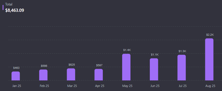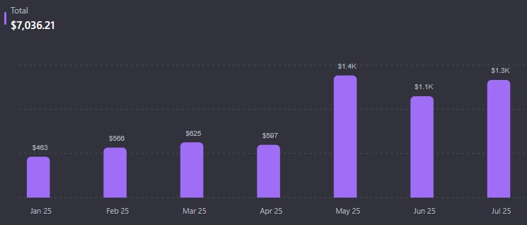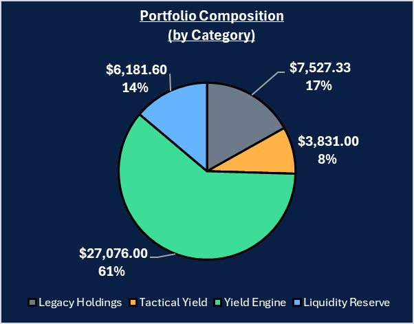 The Liquidity Reserve increased 44.2% to $7,374. The rise came from fresh capital and income that was intentionally held rather than reinvested. In a declining market, this shift toward liquidity added stability and positions the portfolio for future opportunities.