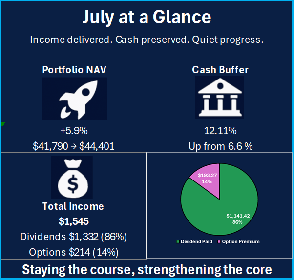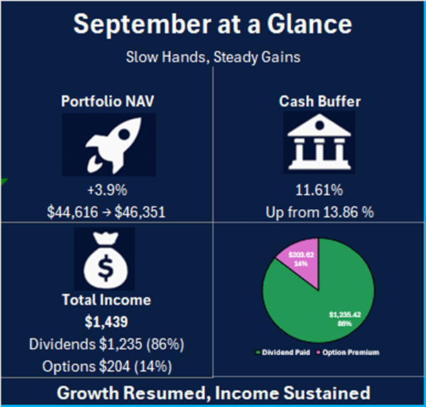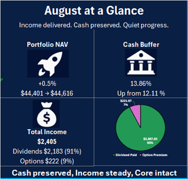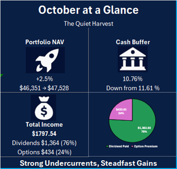 The income mix shifted heavily toward dividends as reduced volatility and a two-week trading pause limited option activity. Despite the contraction, income generation continued and the portfolio maintained positive cash inflow through a difficult month.