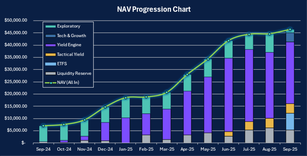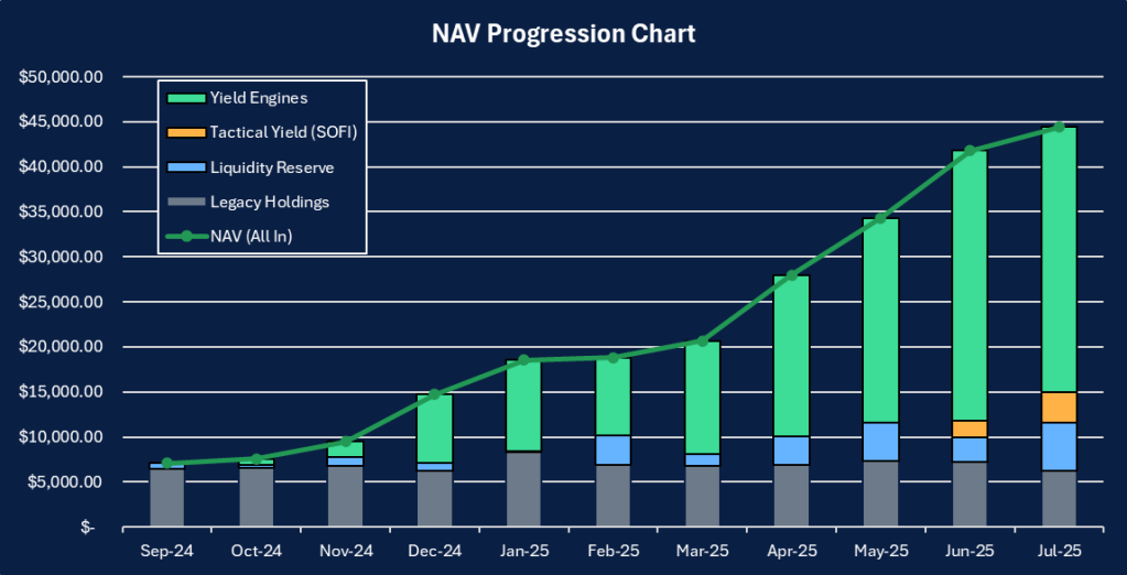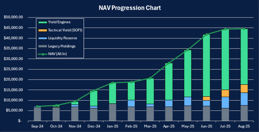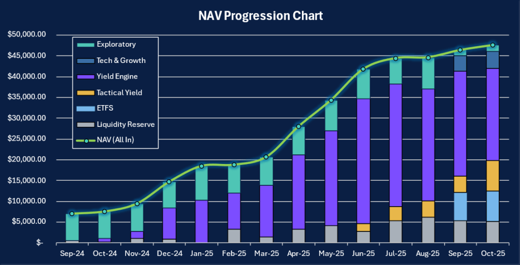 By that measure, we stayed intact. There were no panic exits and no collapse in structure. Income continued, the Liquidity Reserve rose to nearly 17%, and the framework absorbed the correction without breaking. NAV took a hit, but the portfolio ended the month with more cash, more flexibility, and a clear plan for the path forward.