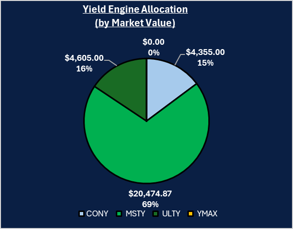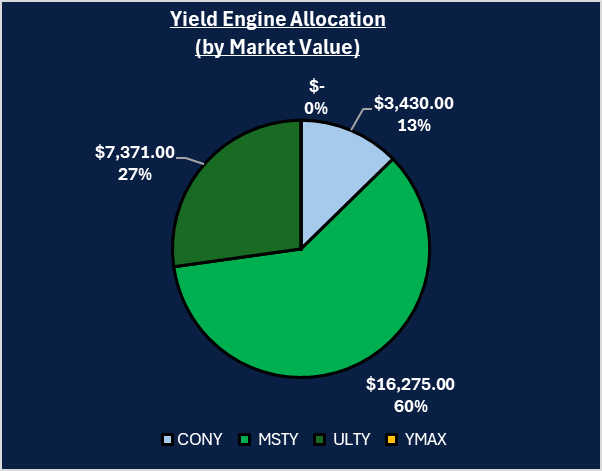 Income fell well below target as the Yield Engine contracted sharply. With MSTY and CONY down more than 25%, the absolute dollar value of distributions declined. Option income also slowed due to reduced trading activity during the holiday period.