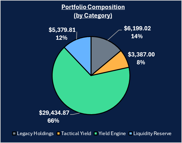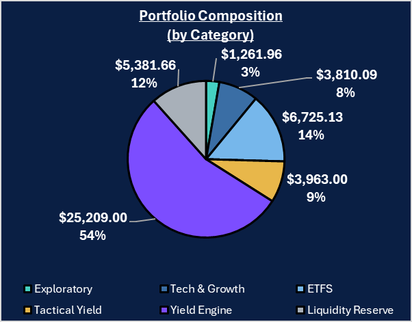 The portfolio closed at $43,714, down 8.0% as crypto linked equities corrected. The structure held, but the drop reflected the sensitivity of high beta positions during a softer volatility environment. - Income Stepped Down