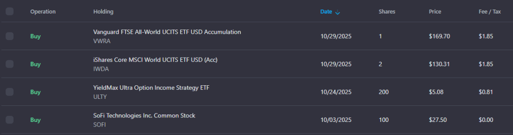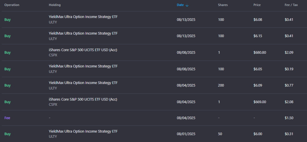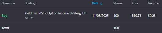 The addition of 100 MSTY shares on 3 Nov was premature. The price was still trending down, and the correction accelerated shortly after, putting the position underwater almost immediately. The strategy behind MSTY remains valid, but a mid month consolidation or a post split entry would have offered a stronger setup. - The Odd Lot Problem with 5UA