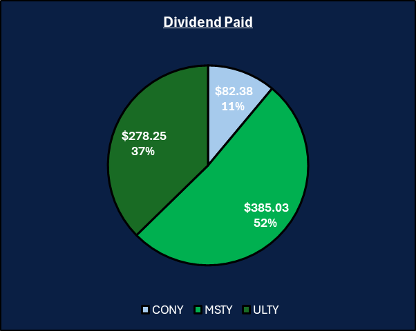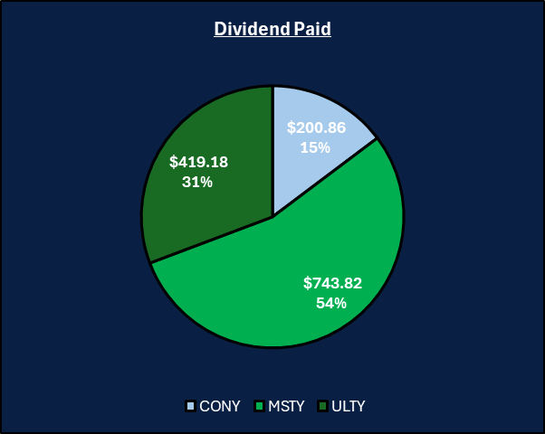 Dividend output fell in line with asset prices as MSTY and CONY declined by roughly 25 to 30 percent. Distributions remained consistent relative to their reduced base values.