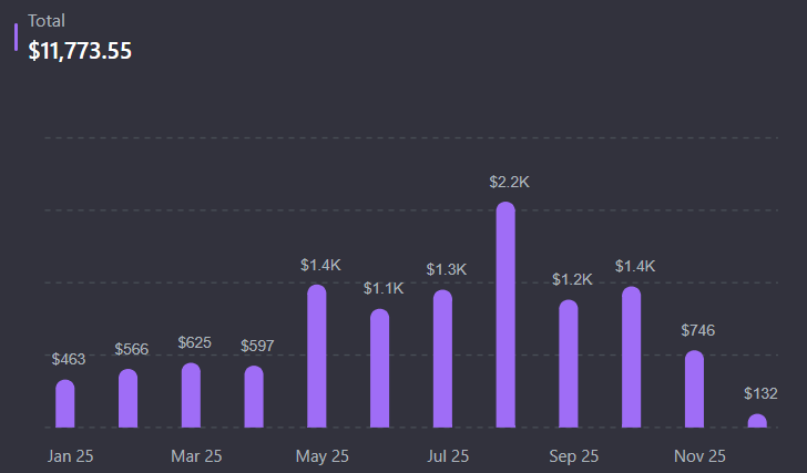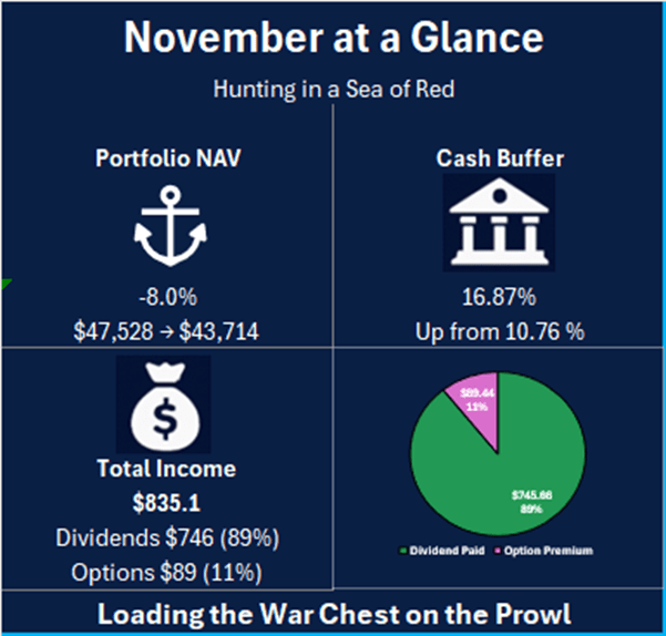 Total income for November came in at $835.10, a 53.5% decline from October. Dividends contributed $746 or 89%, while options added $89.44 or 11%. The drop reflected the contraction in asset values and the planned reduction in trading during softer volatility conditions.