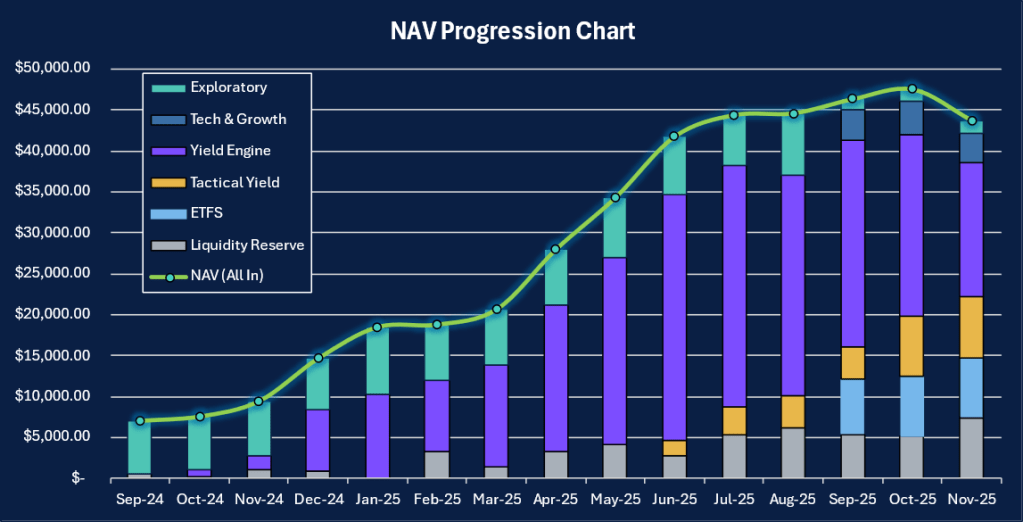 The steady climb of the past quarter met a clear pause in November. The portfolio closed the month at $43,714, an 8.0% pullback from October’s peak. On the chart, this drop ends a four-month stretch of gains and brings Net Asset Value back to levels last seen in late August.
