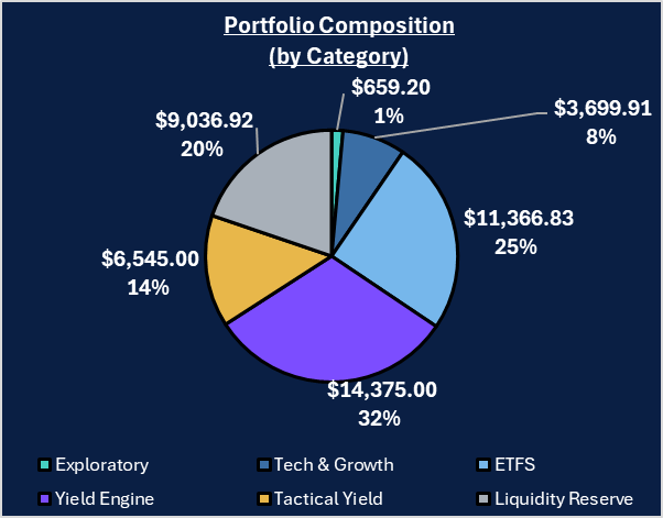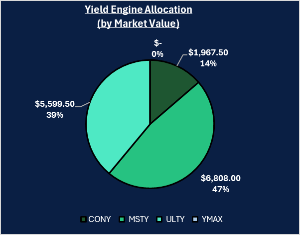 The Yield Engine fell to $14,375, down $2,110 or 12.8%. MSTY, CONY, and ULTY completed reverse splits but continued declining. These positions paid out $801 in distributions while losing $2,110 in value. - Major ETF Deployment