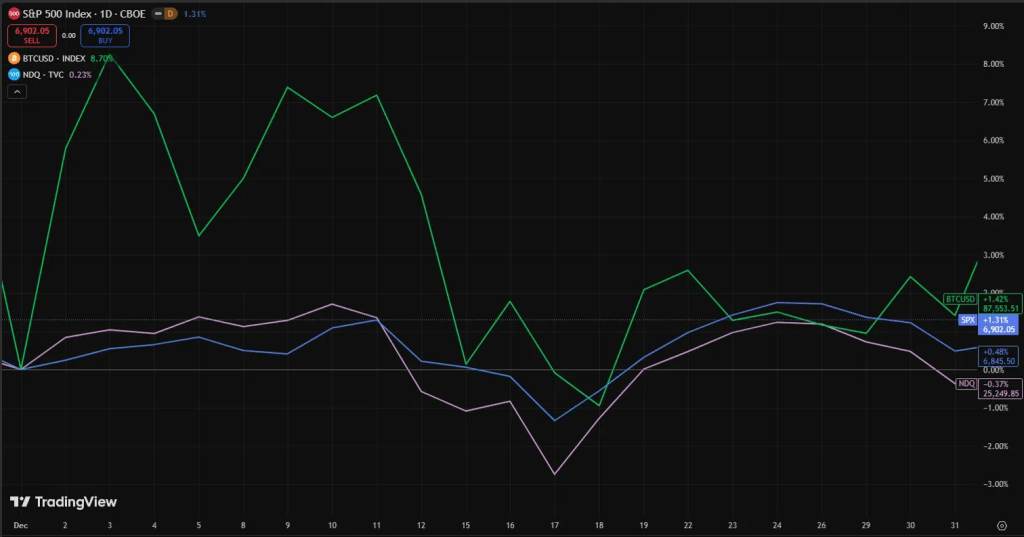 December delivered sharp reversals across markets. The S&P 500 closed up 1.2% after a volatile month. The Nasdaq finished flat. Bitcoin failed to rally and drifted lower through the entire period.