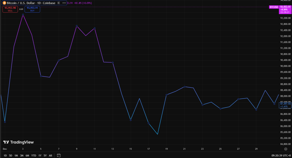 Bitcoin entered December under pressure after losing the $100,000 level in November. The expectation was for a holiday recovery rally into year-end. That recovery never materialized.