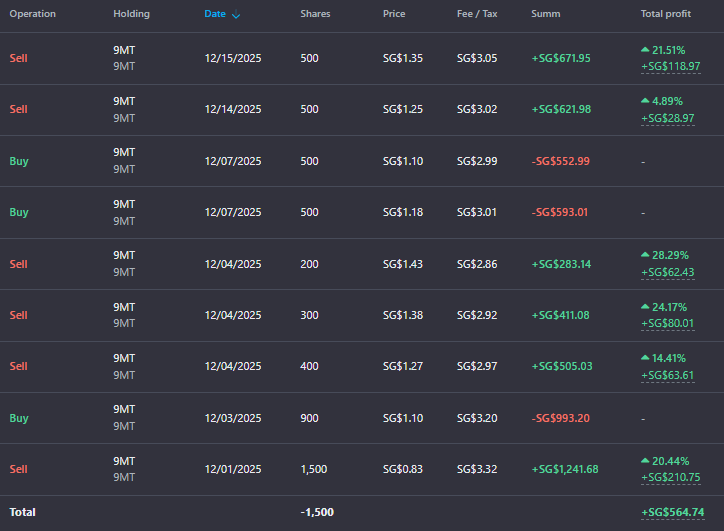 The 9MT position was actively traded throughout December before being fully liquidated. The sequence included multiple buys and sells as the stock fluctuated between $0.83 and $1.43. The final exit occurred on December 15th with the sale of 500 shares at $1.35. Total realized gain on 9MT trades for the month: $564.74.