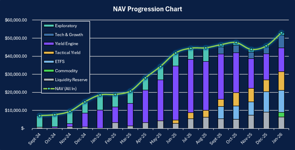 January was a transitional success despite missing the income target. The sudden drop in Bitcoin and the broader “Warsh Shock” forced a strategic retreat from legacy yield engines. By deploying liquidity into Commodities and Semiconductors, the portfolio successfully traded short-term yield for long-term structural resilience.