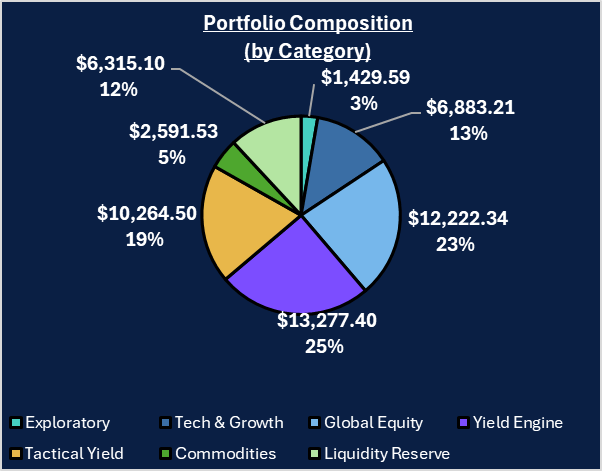 The ETF sleeve was increased to $12,222. However, $2,592 was diverted into the newly established Commodity Pillar to prioritize non-correlated diversification over broad index exposure.