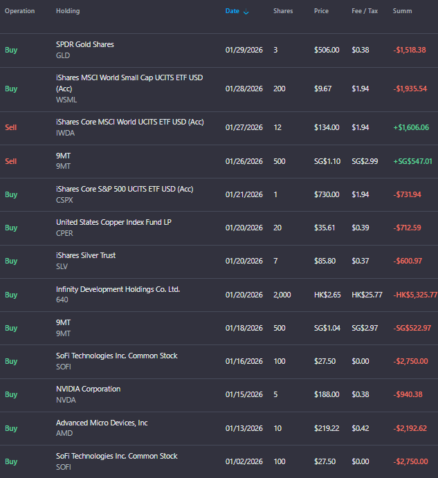 The ETF sleeve underwent a significant quality tilt late in the month. On 27-Jan-2026, the portfolio fully liquidated its IWDA position, selling 12 shares at $134.00. The proceeds were immediately rotated on 28-Jan-2026into a new opening position of 200 shares in WSML (Small-Cap Value) at $9.67.